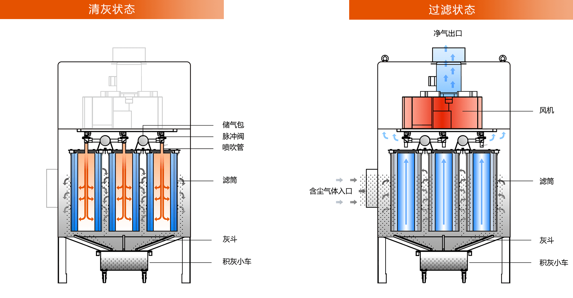 通過反復小幅度的沖擊振動,將積聚在濾筒外部的粉塵震落至灰斗內。